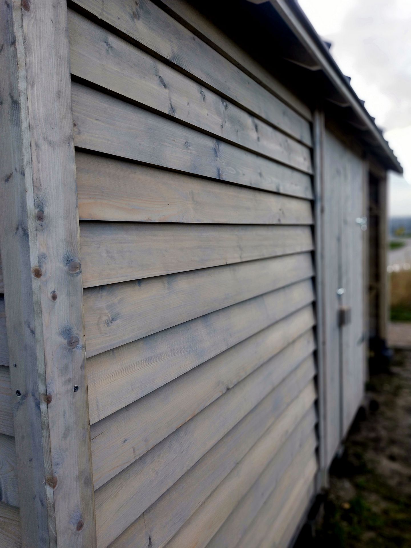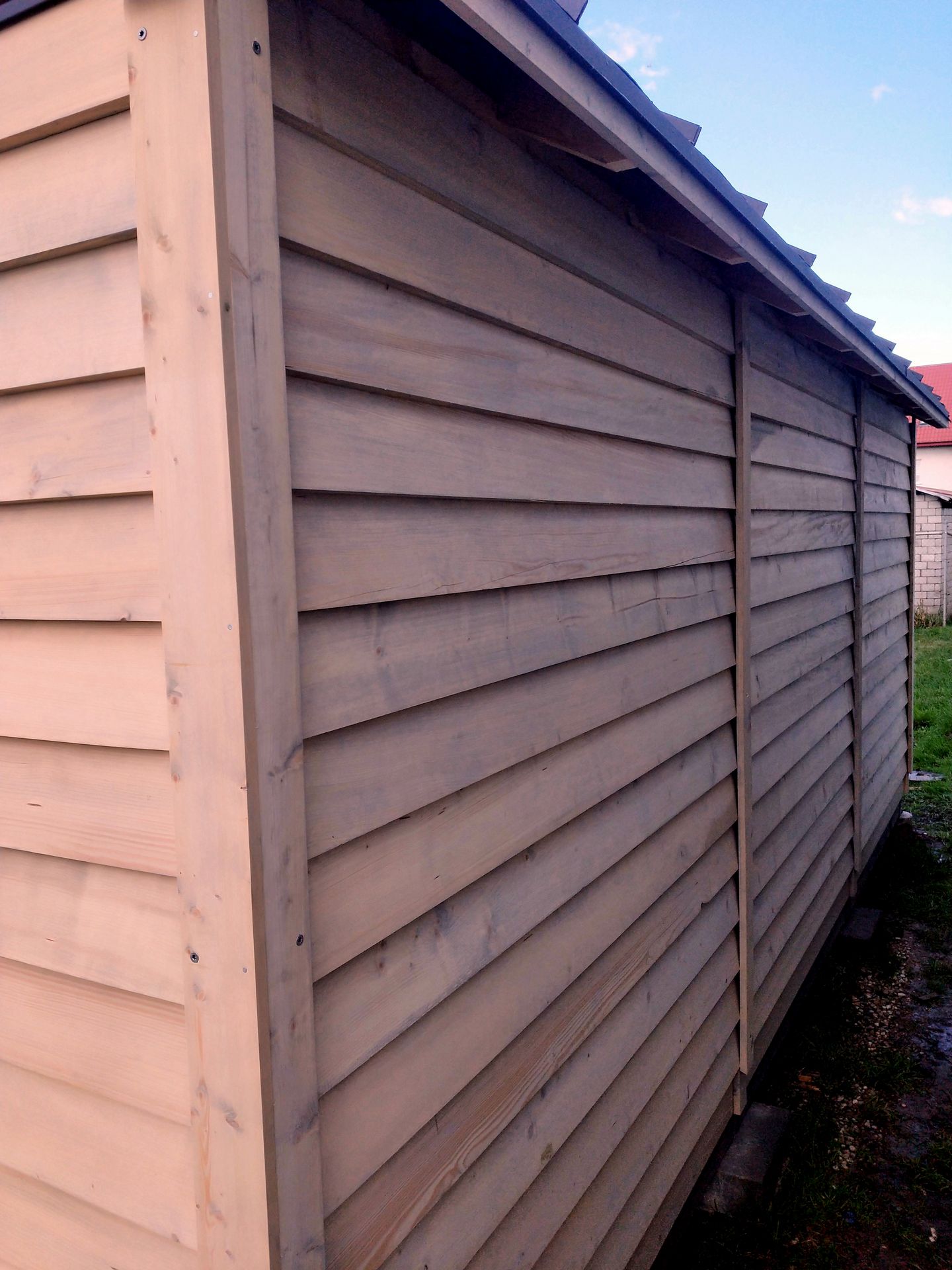 Elewacja domku z desek gładkich o wymiarach 2x15cm układanych na zakład poziomo.