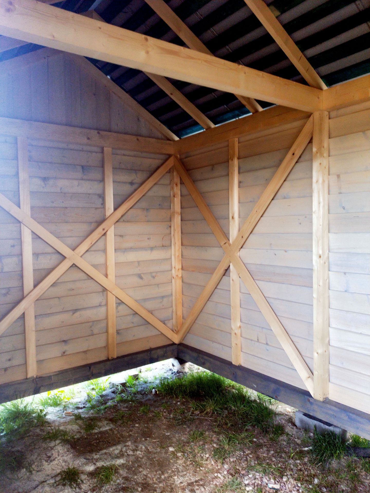 Ogrodowy domek narzędziowy o wymiarach 5,6m x 2,6m wykonany z drewna, wolnostojący z dachem dwuspadowym.
