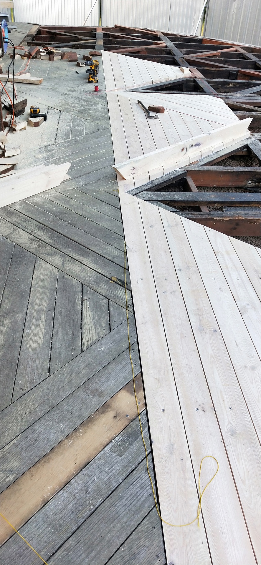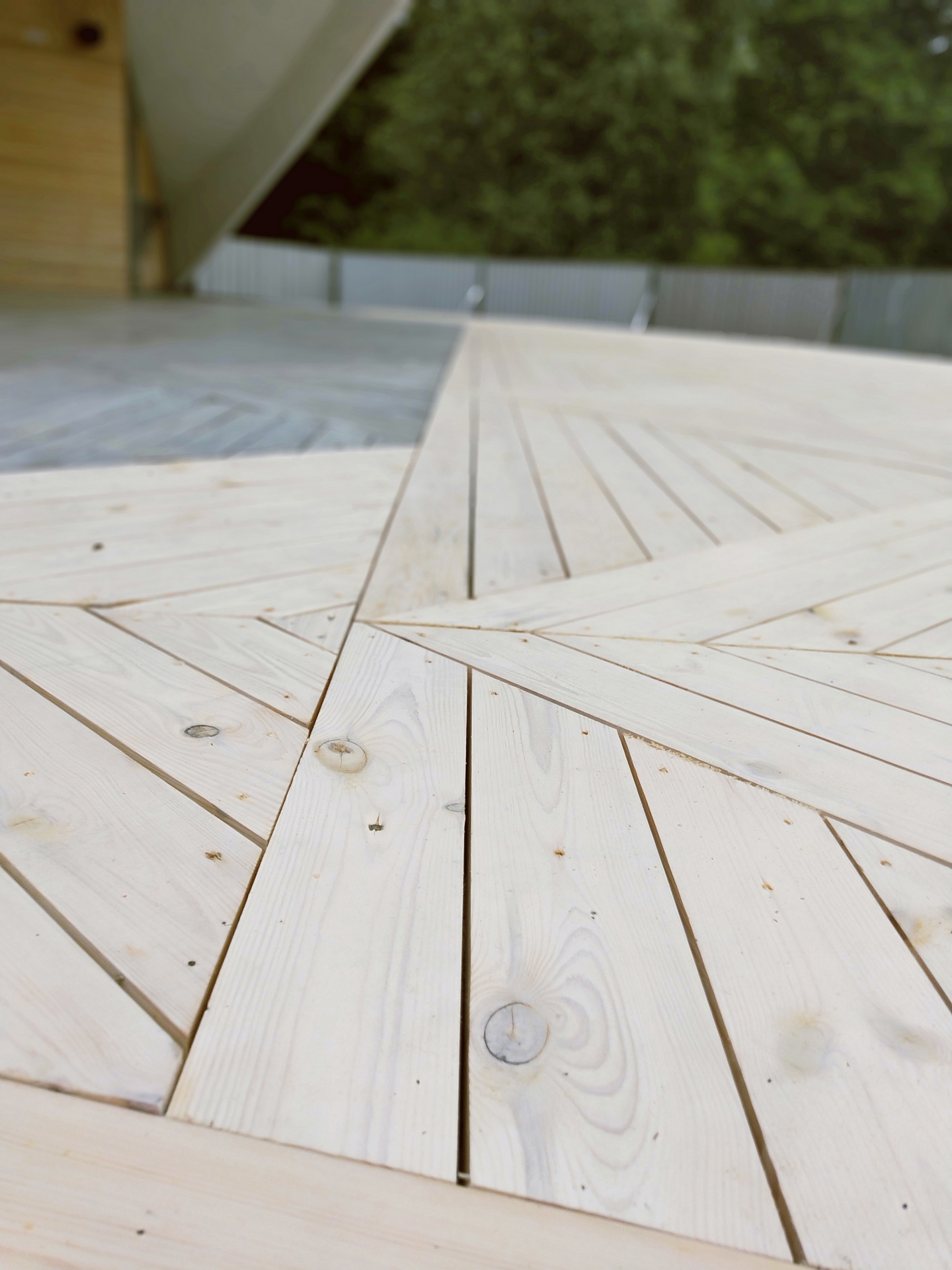 Deski układane zgodnie ze wzorem (trójkąty prostokątne, równoramienne o wymiarach ok 130x130cm).