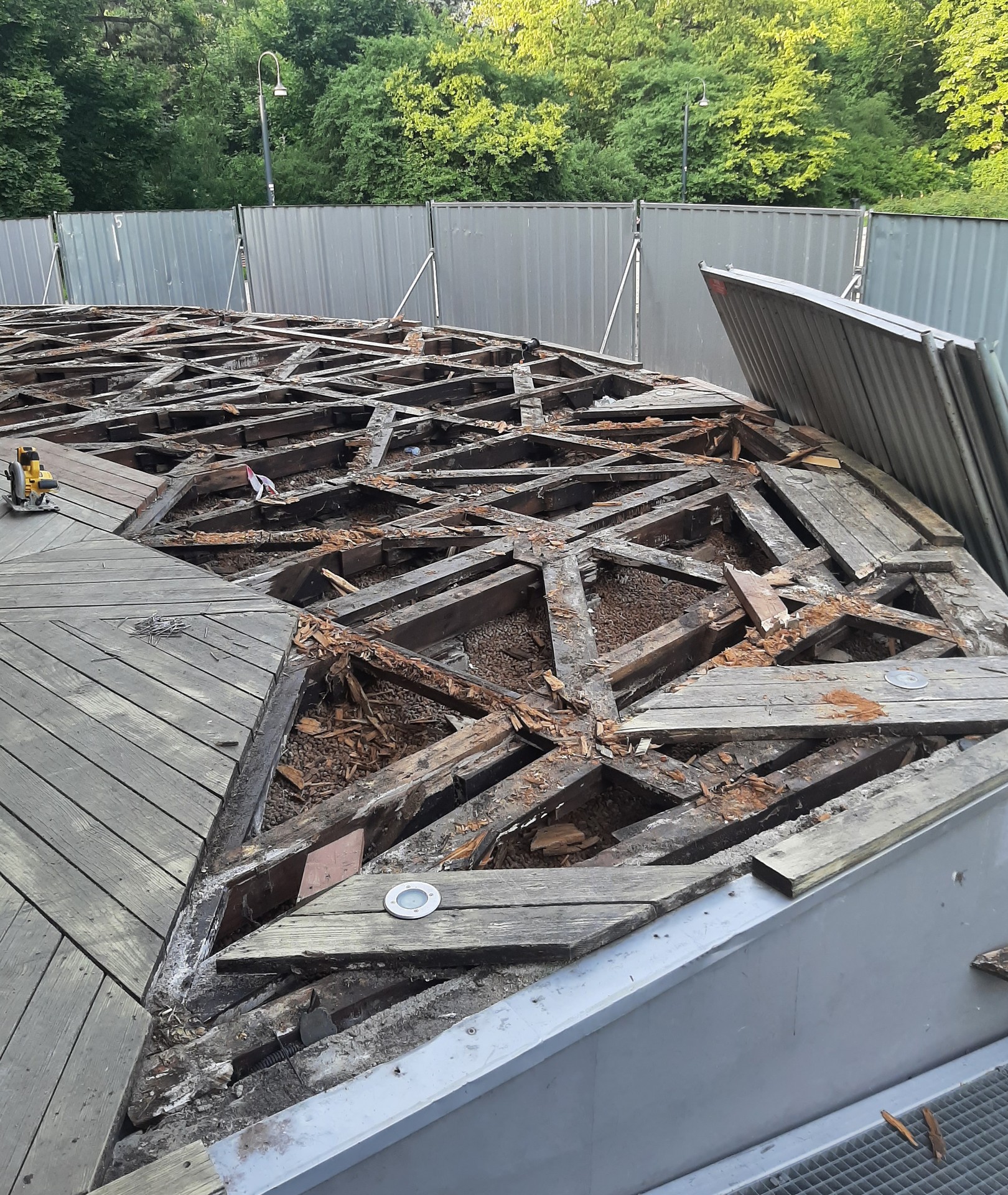 Wymieniono częściowo spróchniałą konstrukcję tarasu a następnie zamontowano nową podłogę z desek sosnowych.