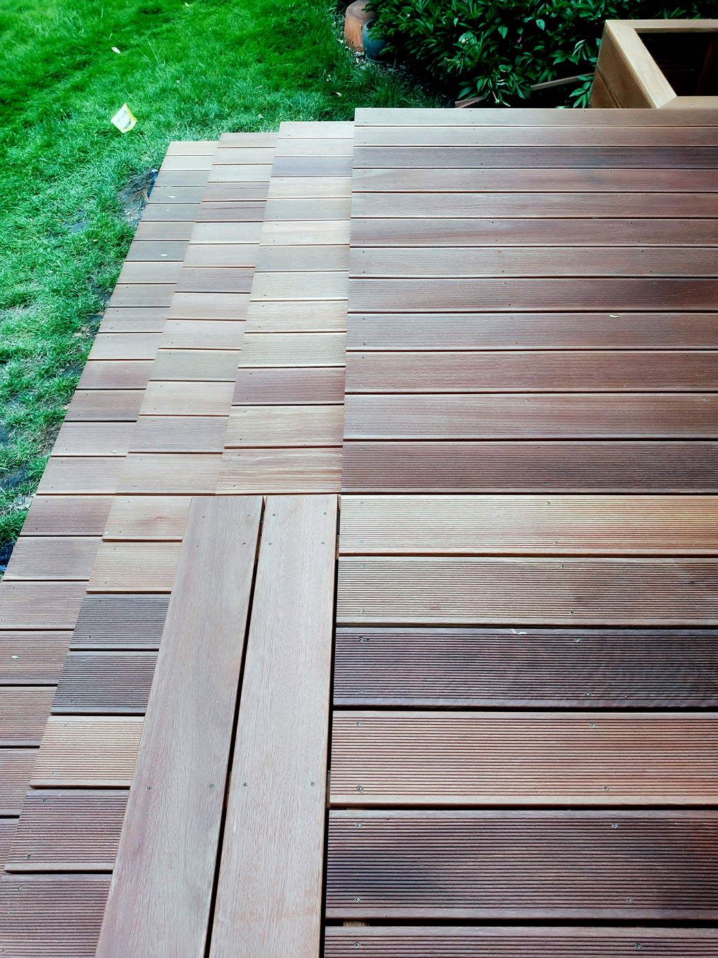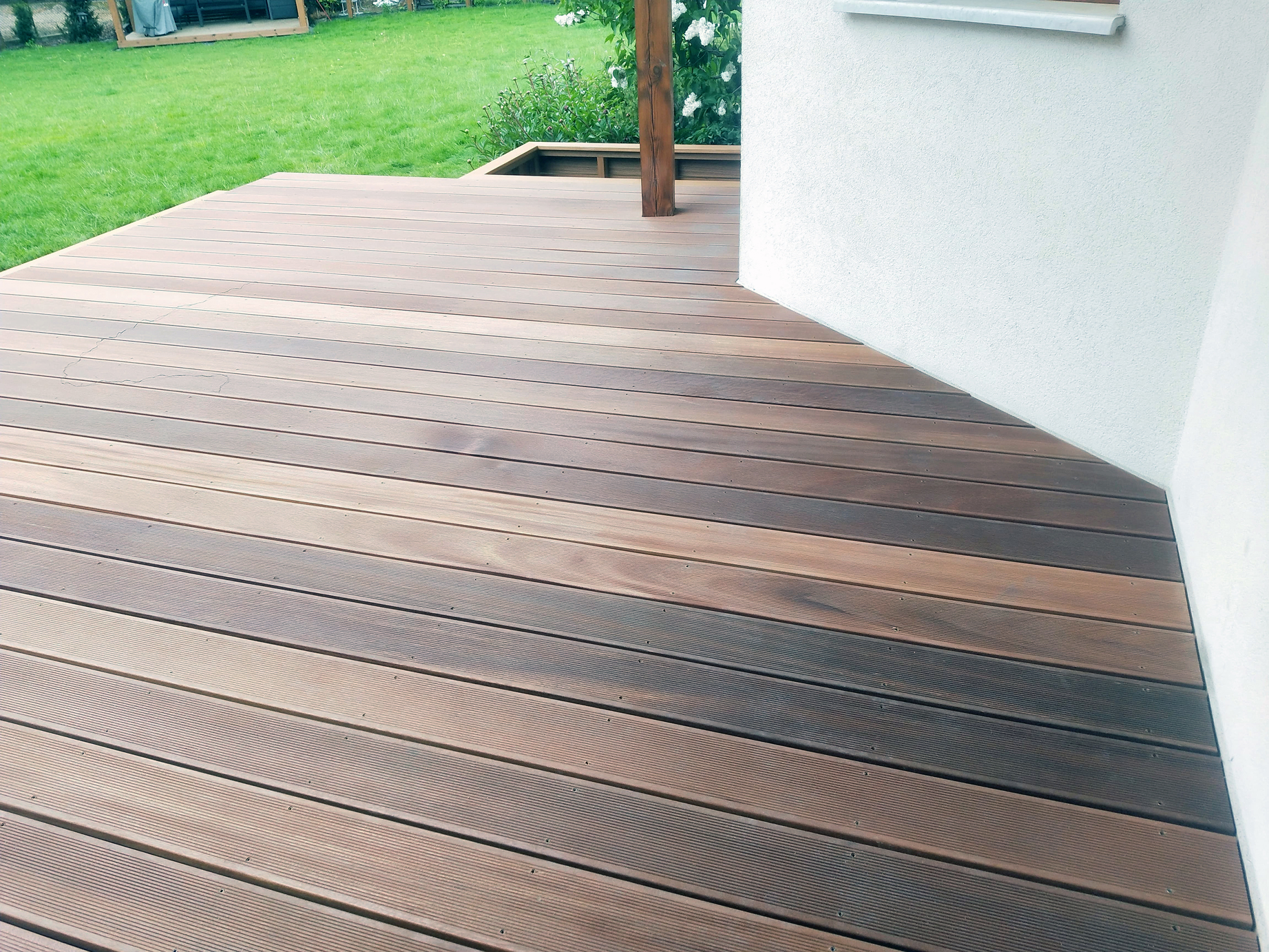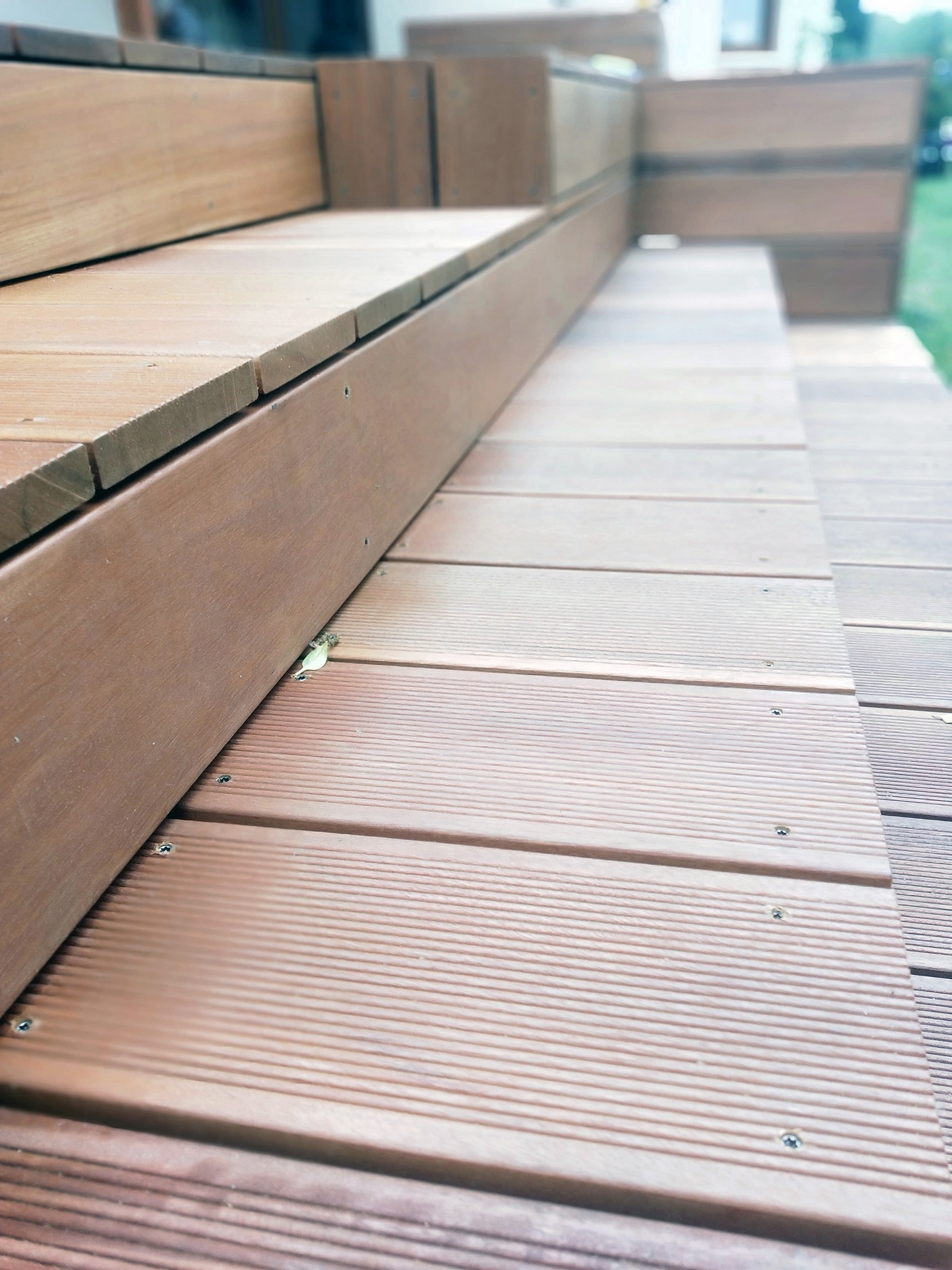 Deseki o wymiarach 145x24 (gładki ryfel) wykonany na istniejącym betonowym tarasie ze schodami.
