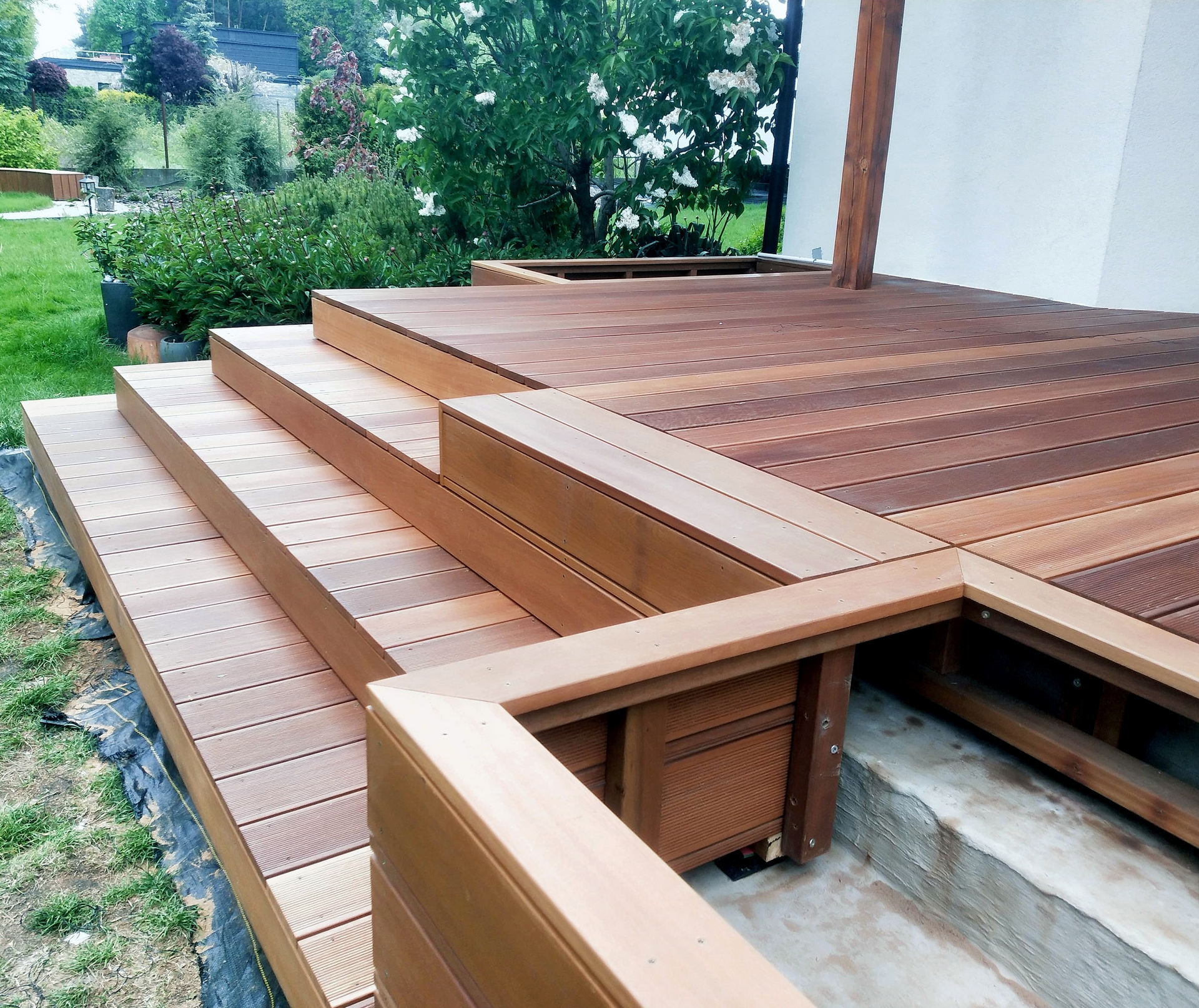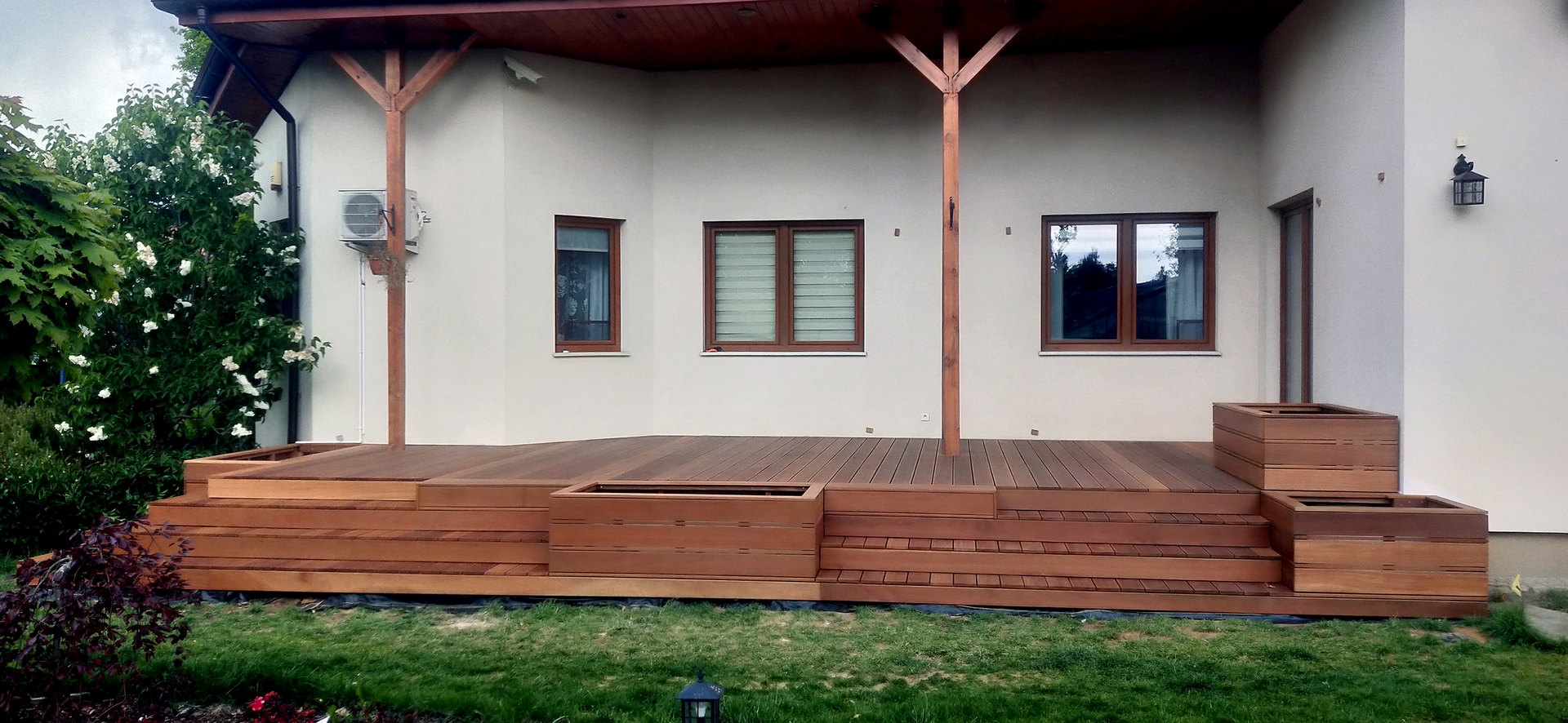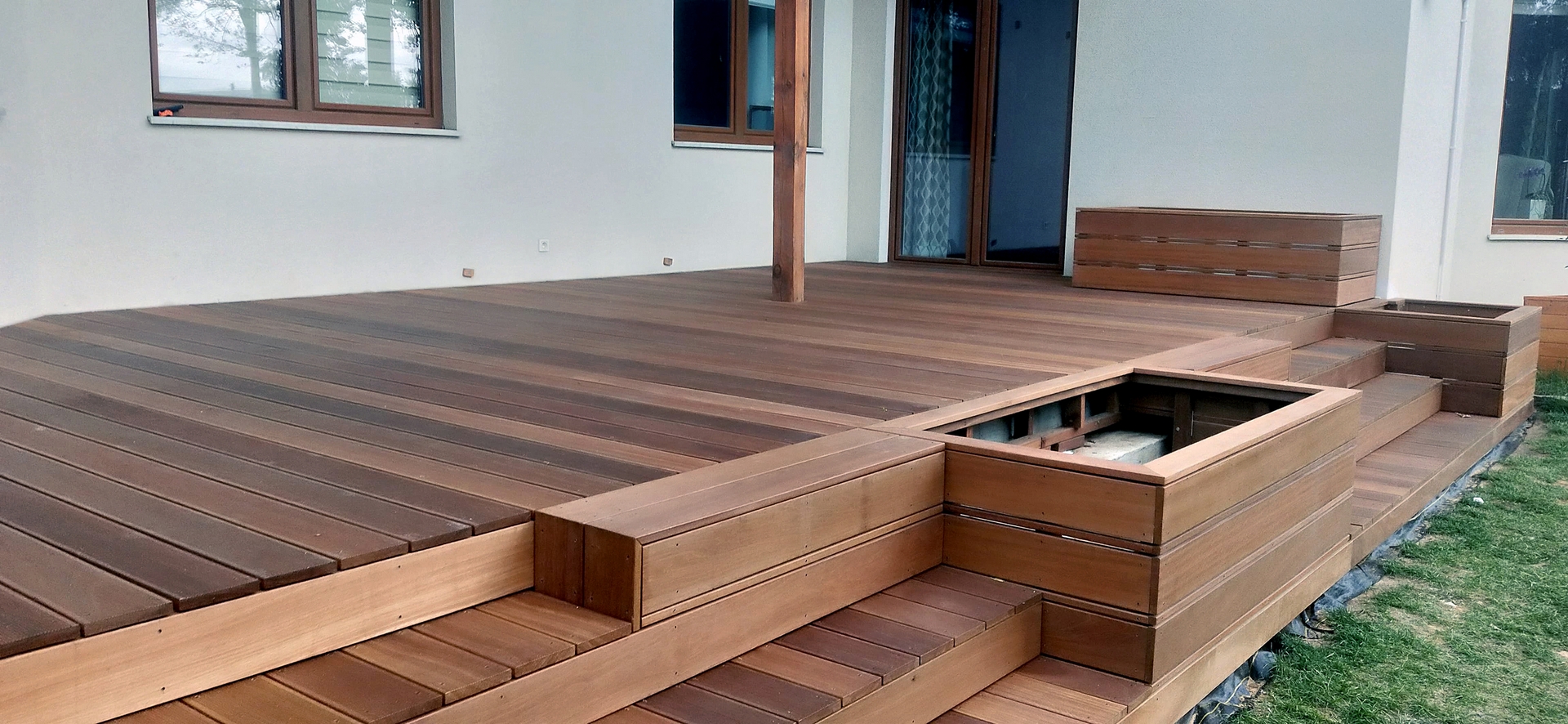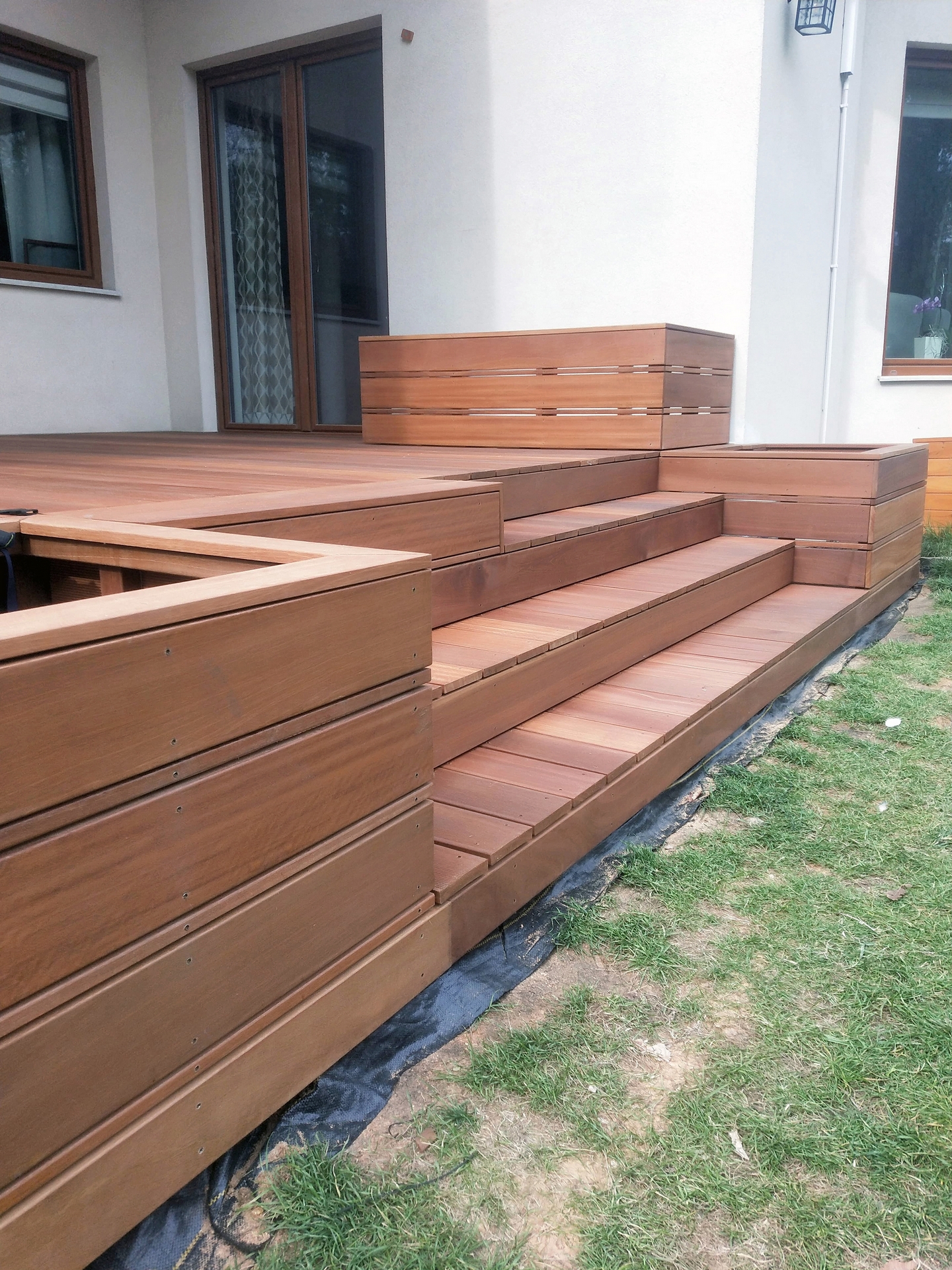 Konstrukcja tarasu z legarów 4x6 również z drewna bangkirai, przykręcone do podłoża na kołki do betonu.