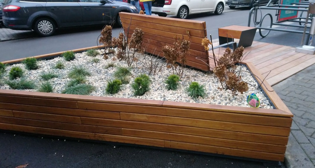 Projekt:Projekt wykonawczy oparty na koncepcji koordynacja 3D Wykonanie:Ławka o konstrukcji stalowej i doniczkaTaras BangkiraiOkładzina IrokoNasadzenia roślin