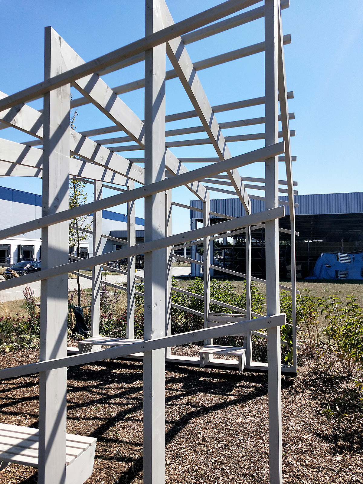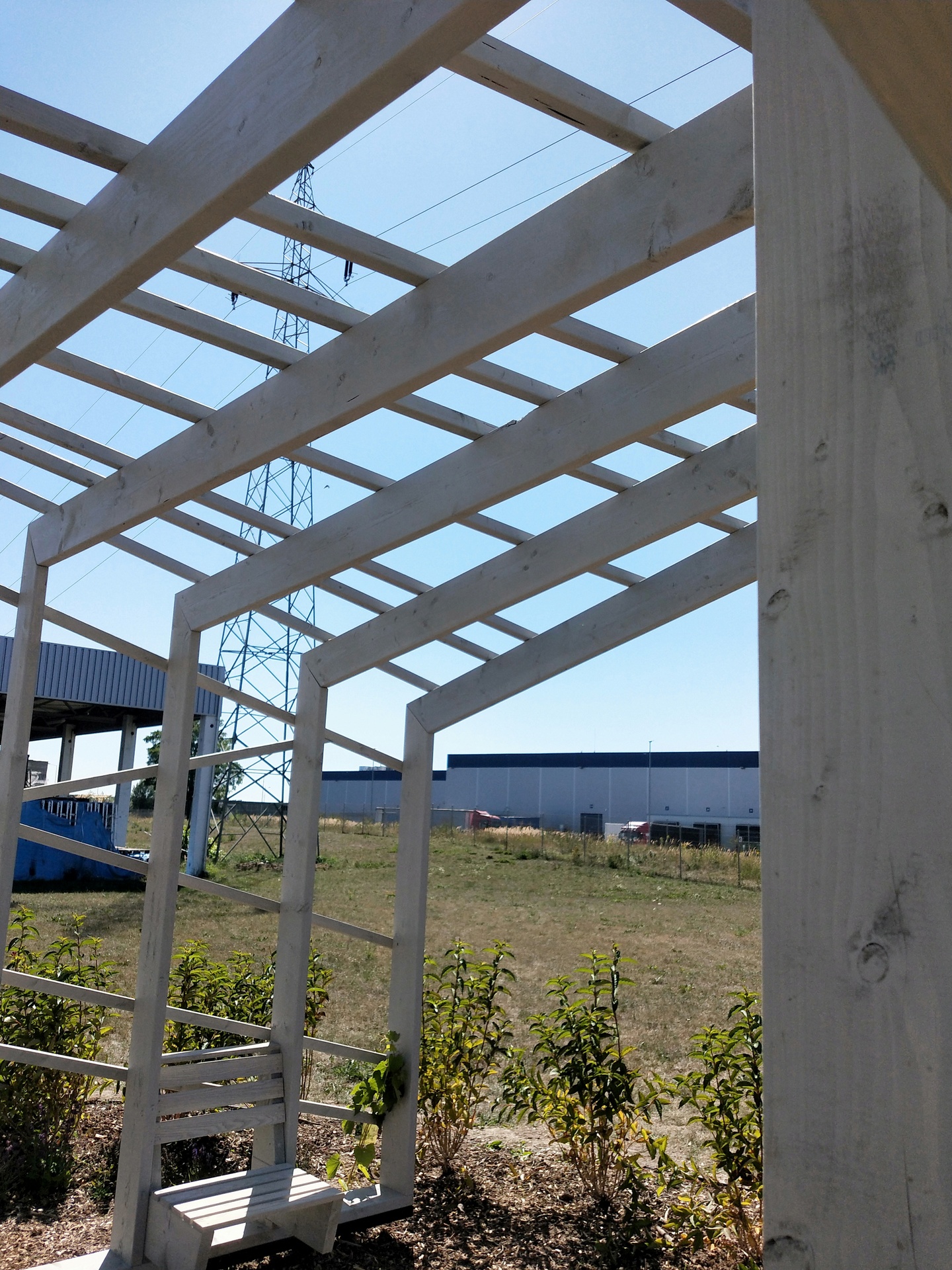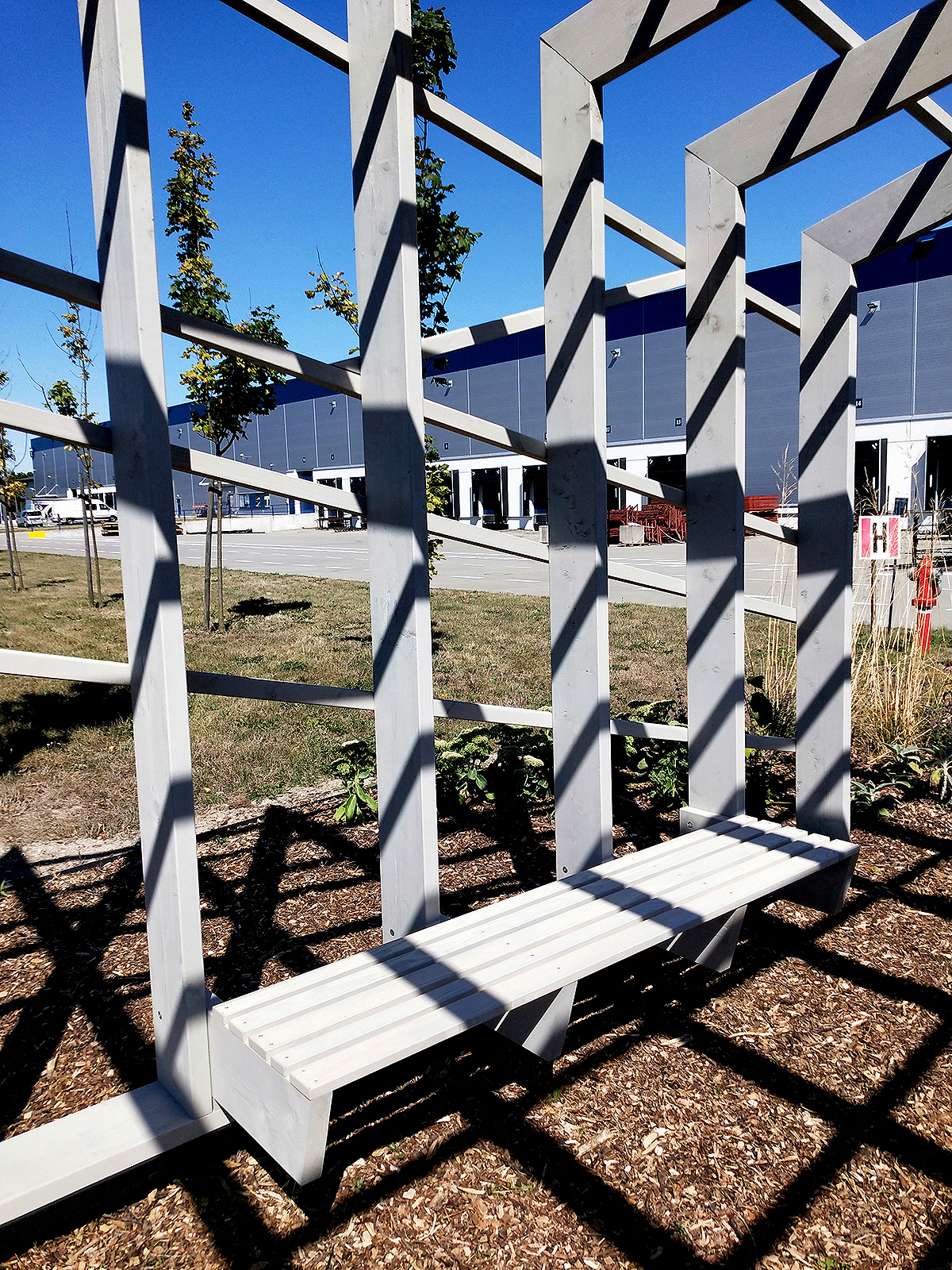 Ciekawa konstrukcja i potężne słupy o przekroju 19,5x4,5 cm sprawiają, że pergola przyciąga wzrok i dominuje w swoim otoczeniu.