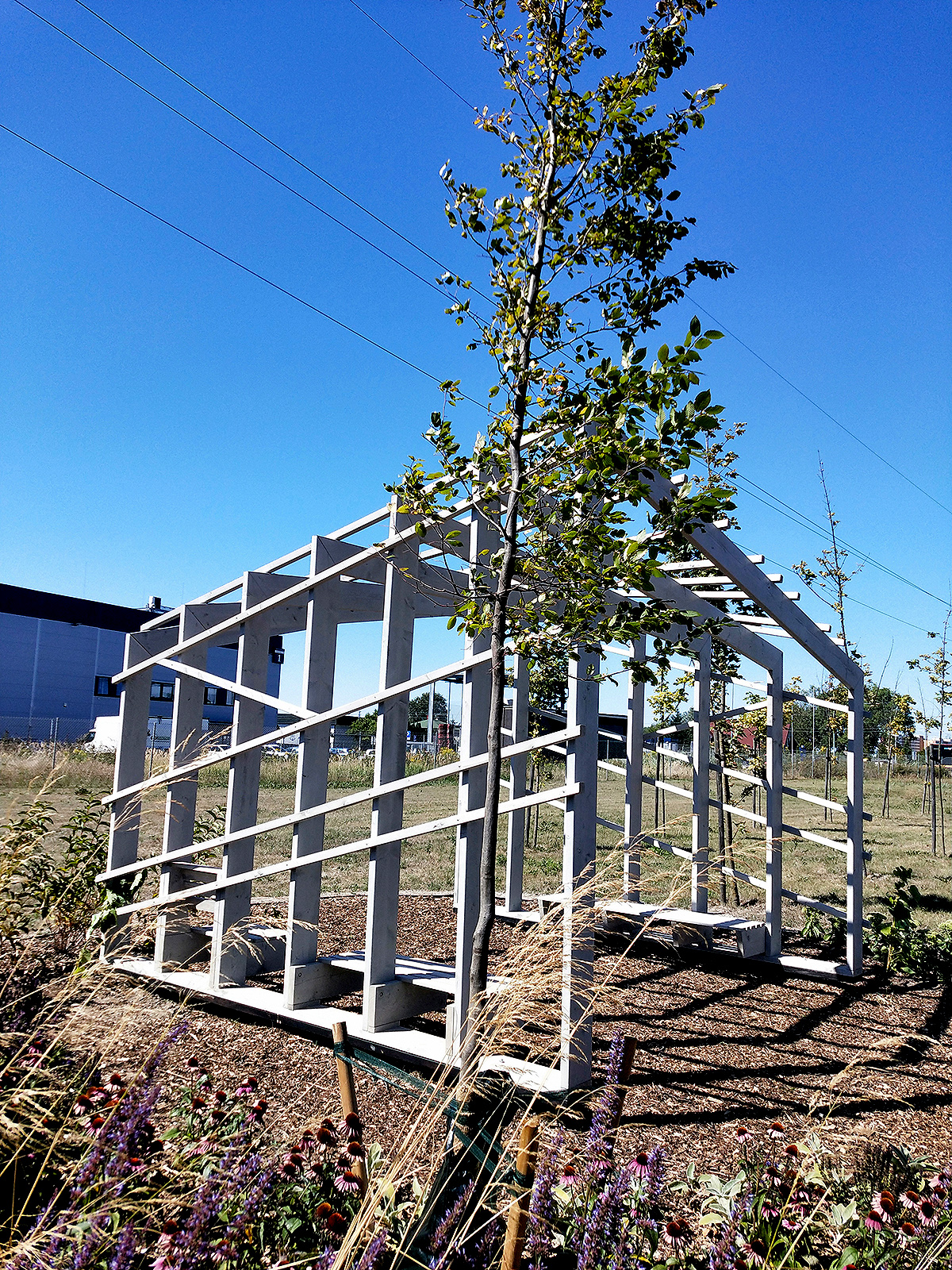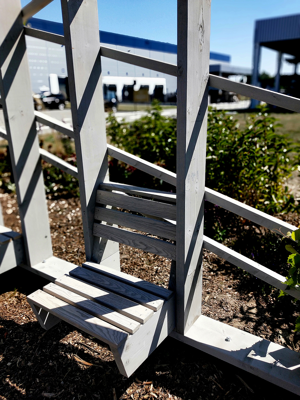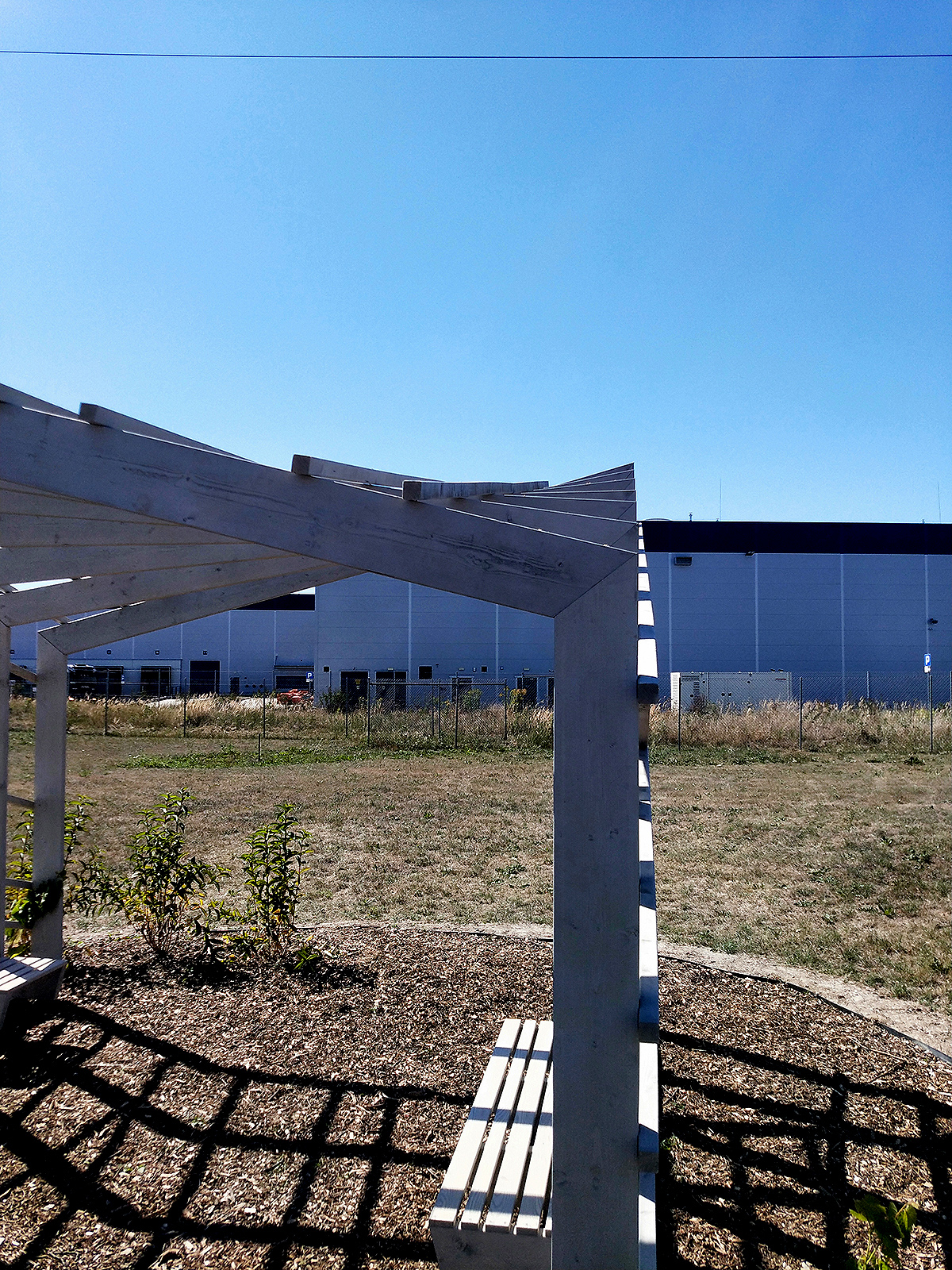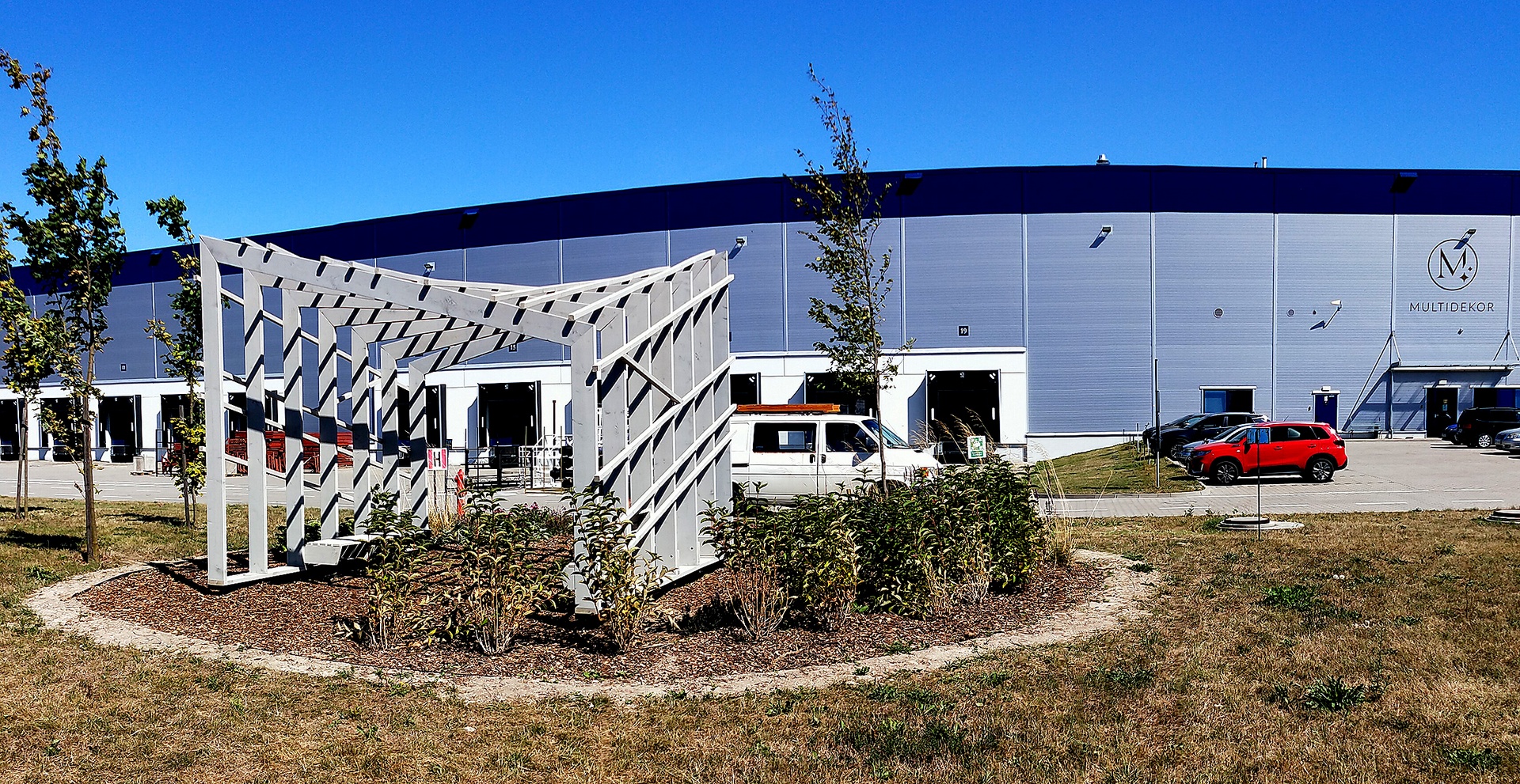 Ciekawa konstrukcja i potężne słupy o przekroju 19,5x4,5 cm sprawiają, że pergola przyciąga wzrok i dominuje w swoim otoczeniu.