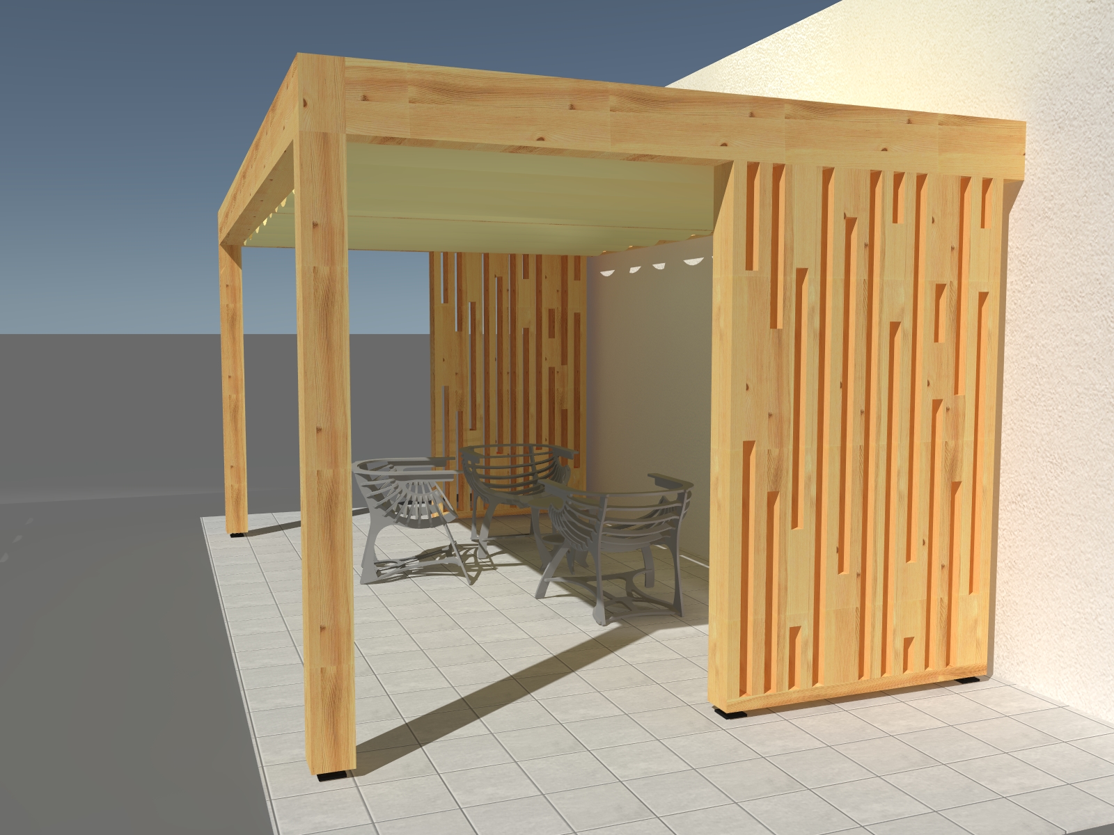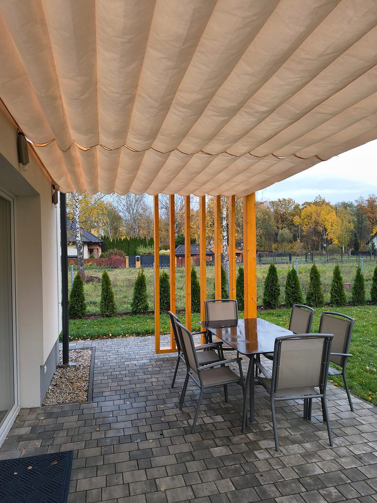 Pergola została wyposażona w poziome rolety rzymskie w kolorze ecri, które zwijane są ręcznie, umożliwiając regulację dopływu światła.