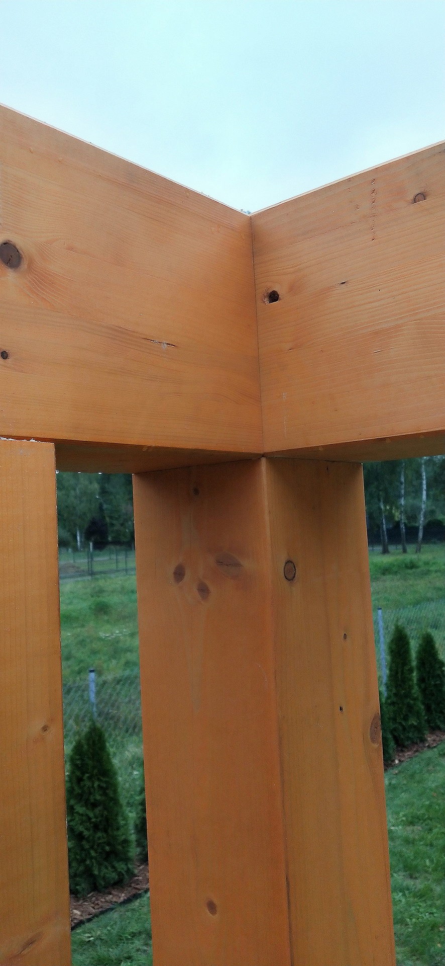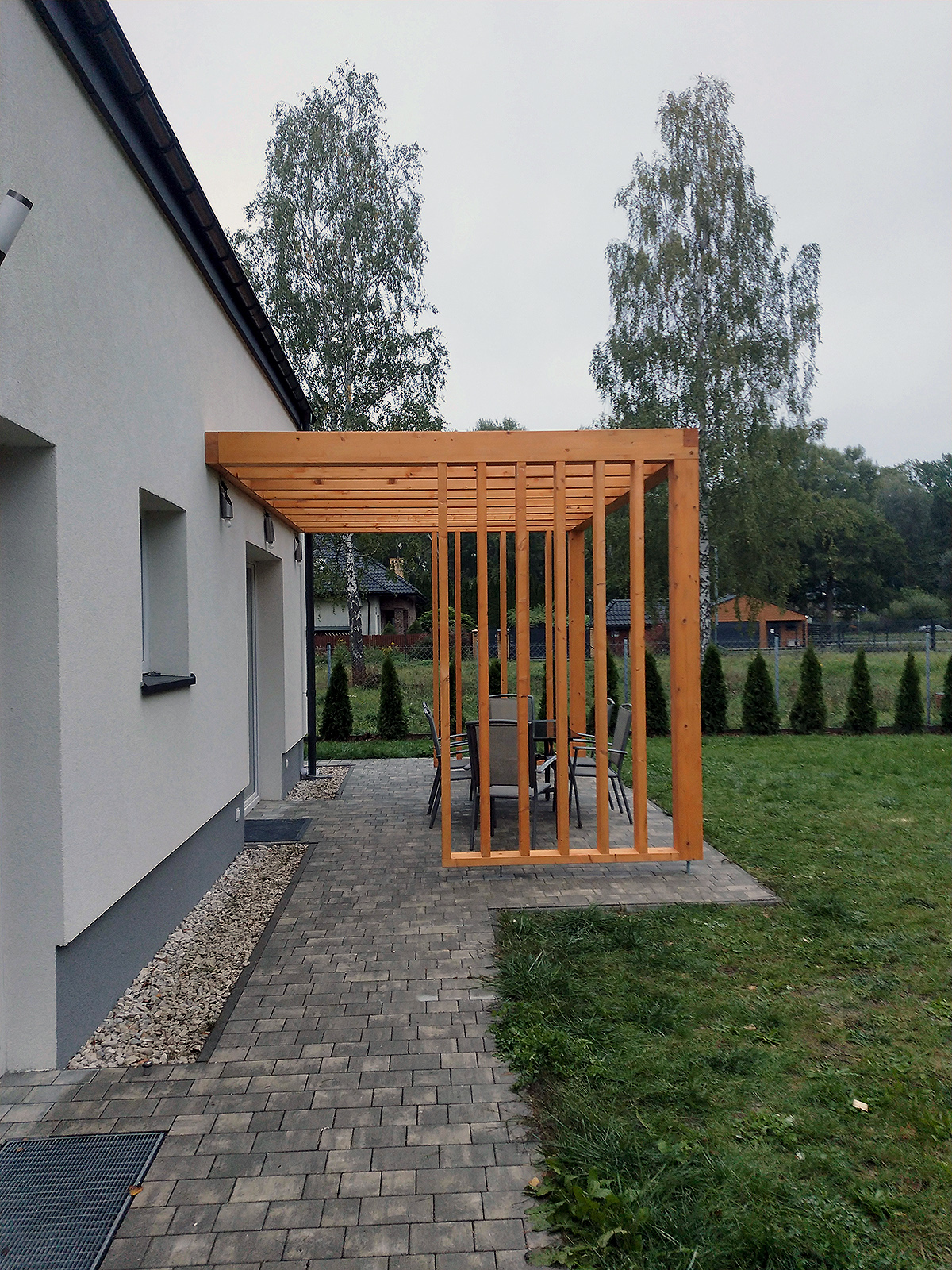Całość konstrukcji została pomalowana impregnatem Koopmans w odcieniu sosna limba, który podkreśla naturalne piękno drewna i zapewnia skuteczną ochronę przed warunkami atmosferycznymi.