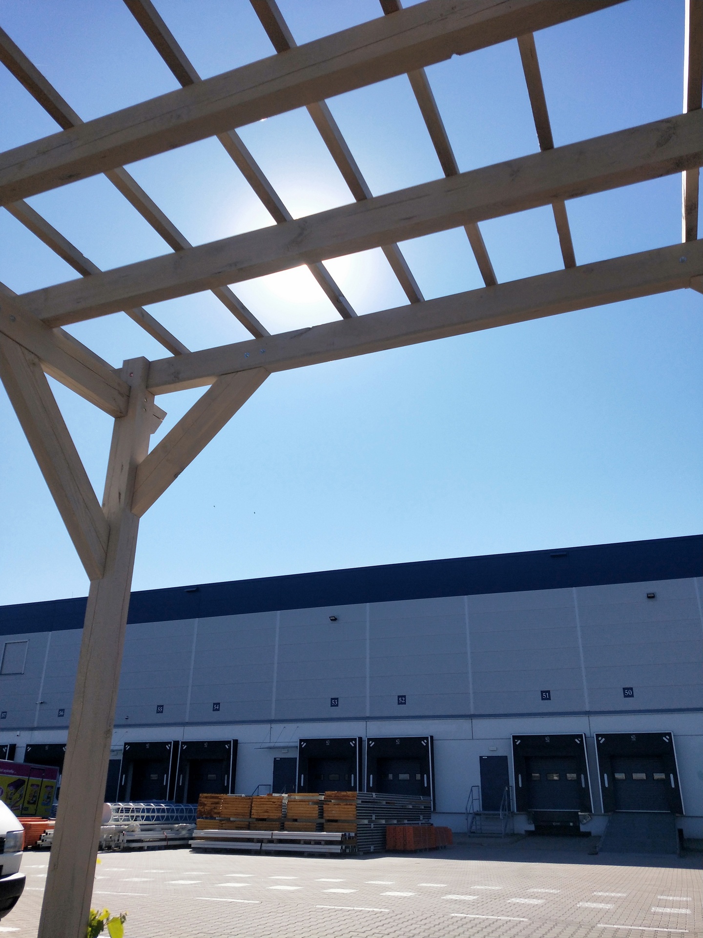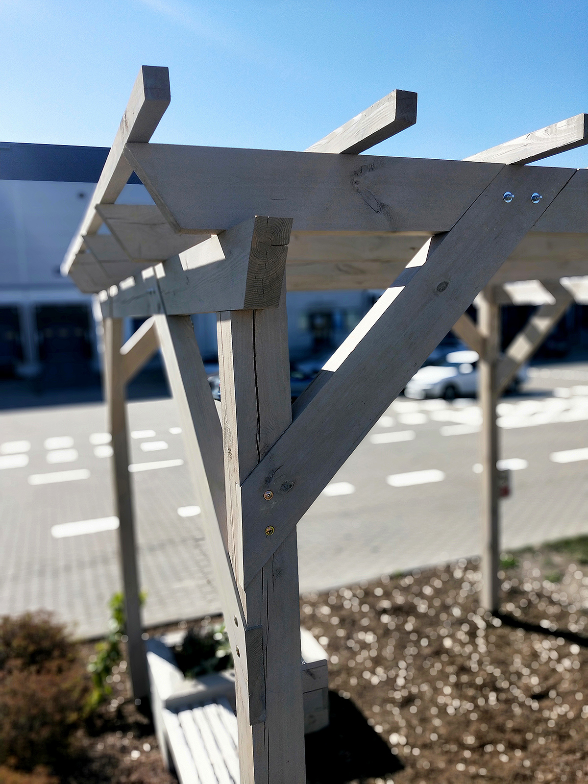 Pergola zamocowana do fundamentów szklankowych wylewanych za pomocą kotew stalowych ocynkowanych.
