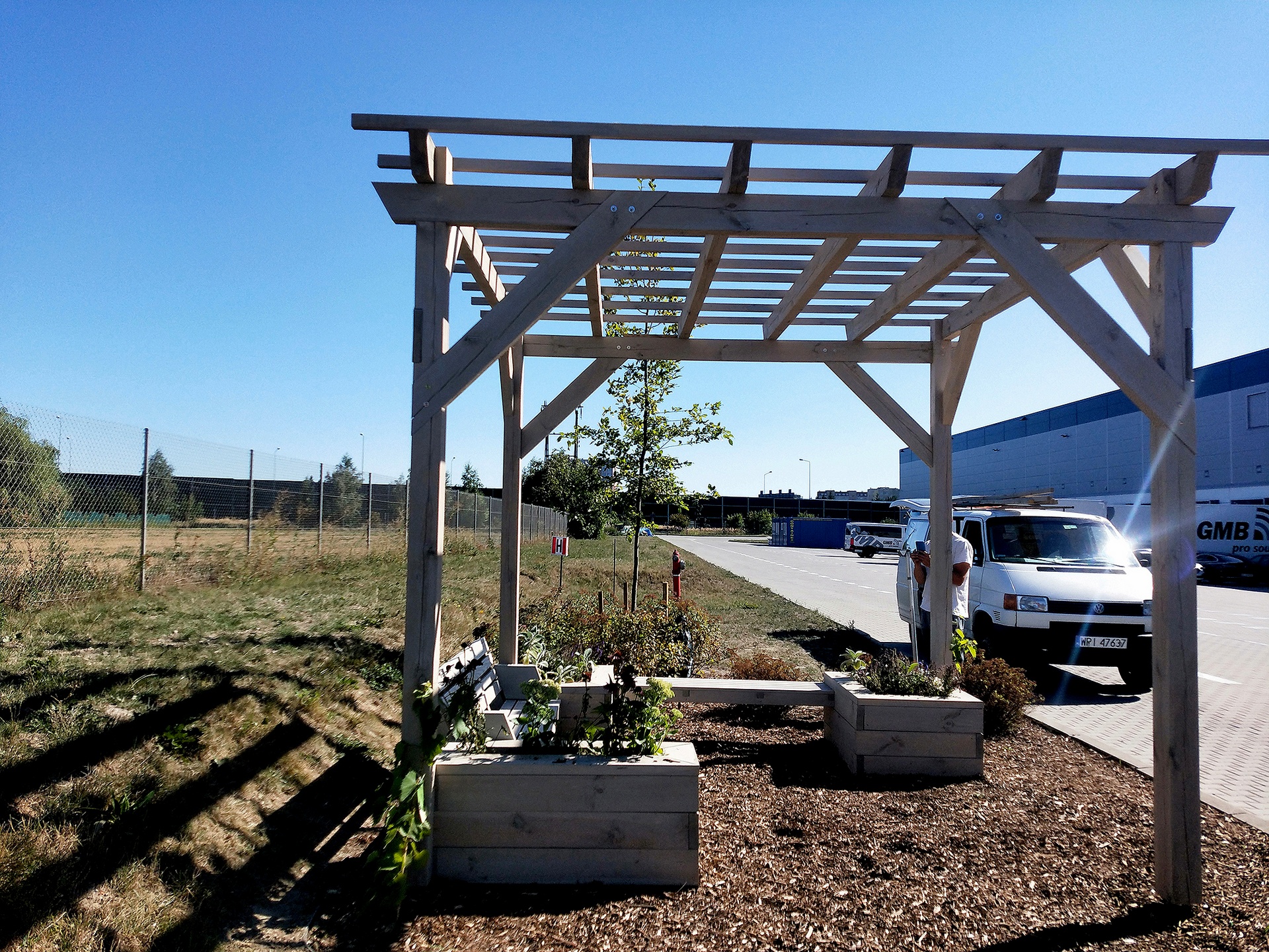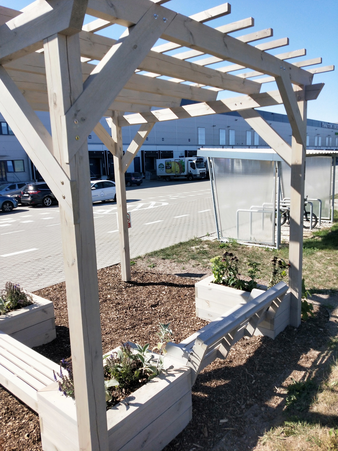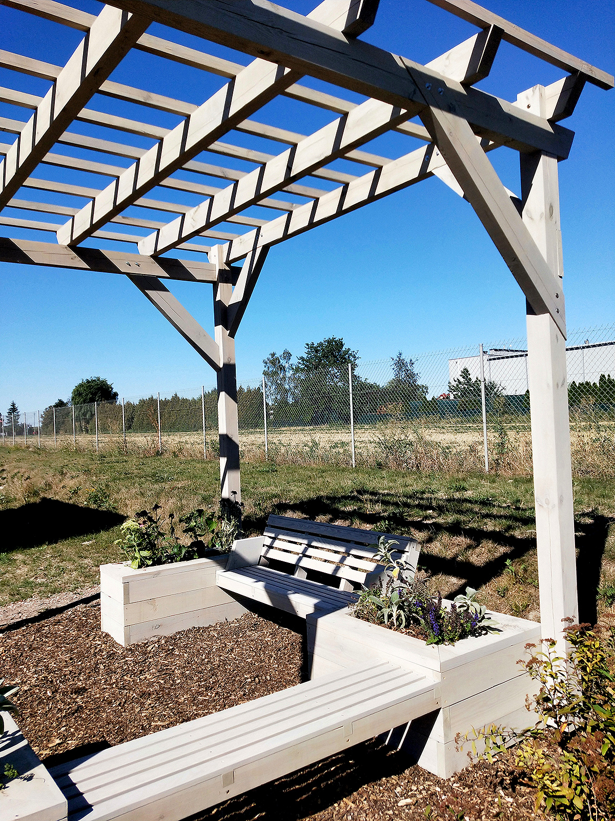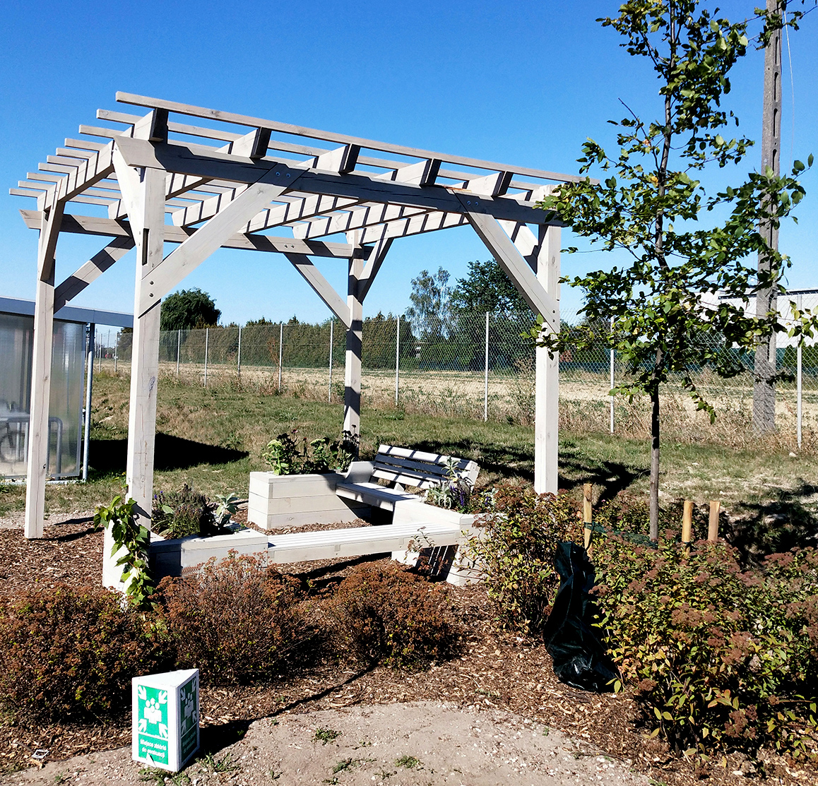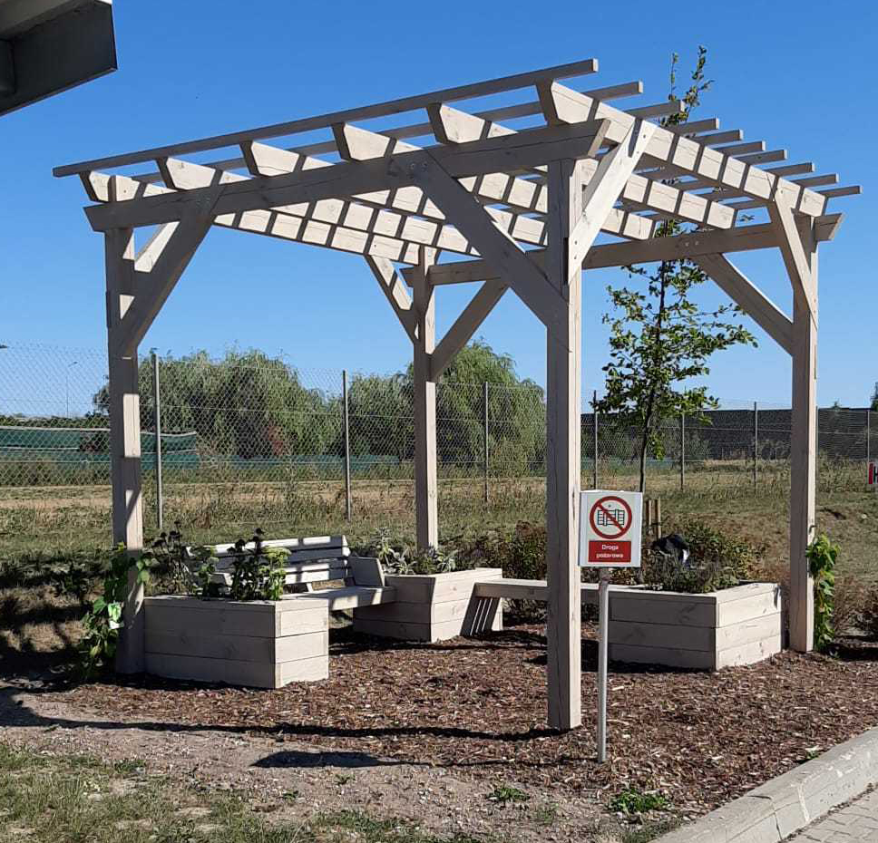 Donice zintegrowane z ławkami wykonane z desek calowych świerkowych, struganych czterostronnie.